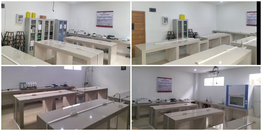 - Fungsi : Laboratorium Kimia Farmasi berfungsi sebagai tempat untuk kegiatan praktikum, pembelajaran, dan penelitian yang berkaitan dengan analisis kimia serta sintesis senyawa obat. Mahasiswa mempelajari teknik analisis kuantitatif dan kualitatif, identifikasi senyawa, serta karakterisasi bahan kimia dan obat. Laboratorium ini juga digunakan untuk pengembangan metode analisis, uji stabilitas, dan kontrol kualitas bahan baku maupun produk jadi, sehingga mendukung penguasaan aspek kimia dalam bidang farmasi.